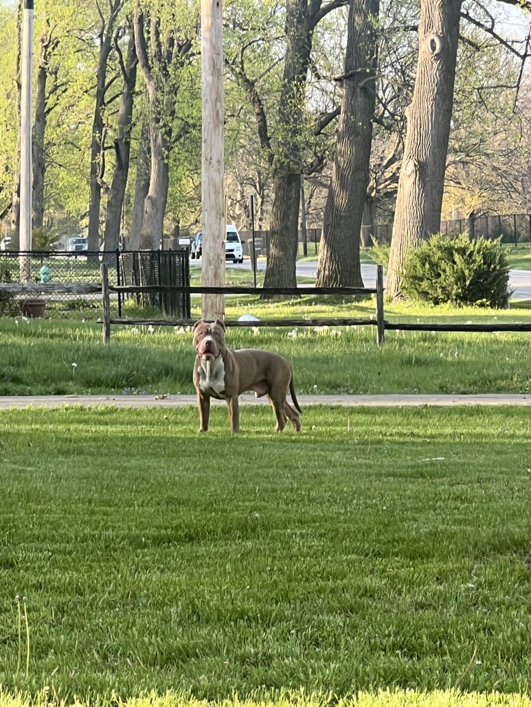 Brown with white underbelly pit mix walking along cold spring rd. Worried he’s going to get hit by a car. Very timid