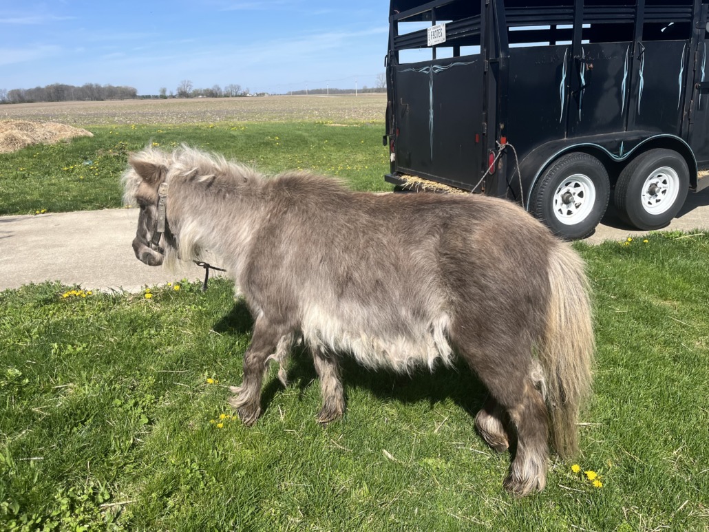 Miniature horse or adult pony found near 1000 N and 500 E in Hancock County. It is wearing a long lead rope.