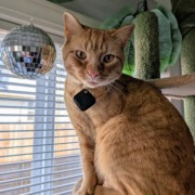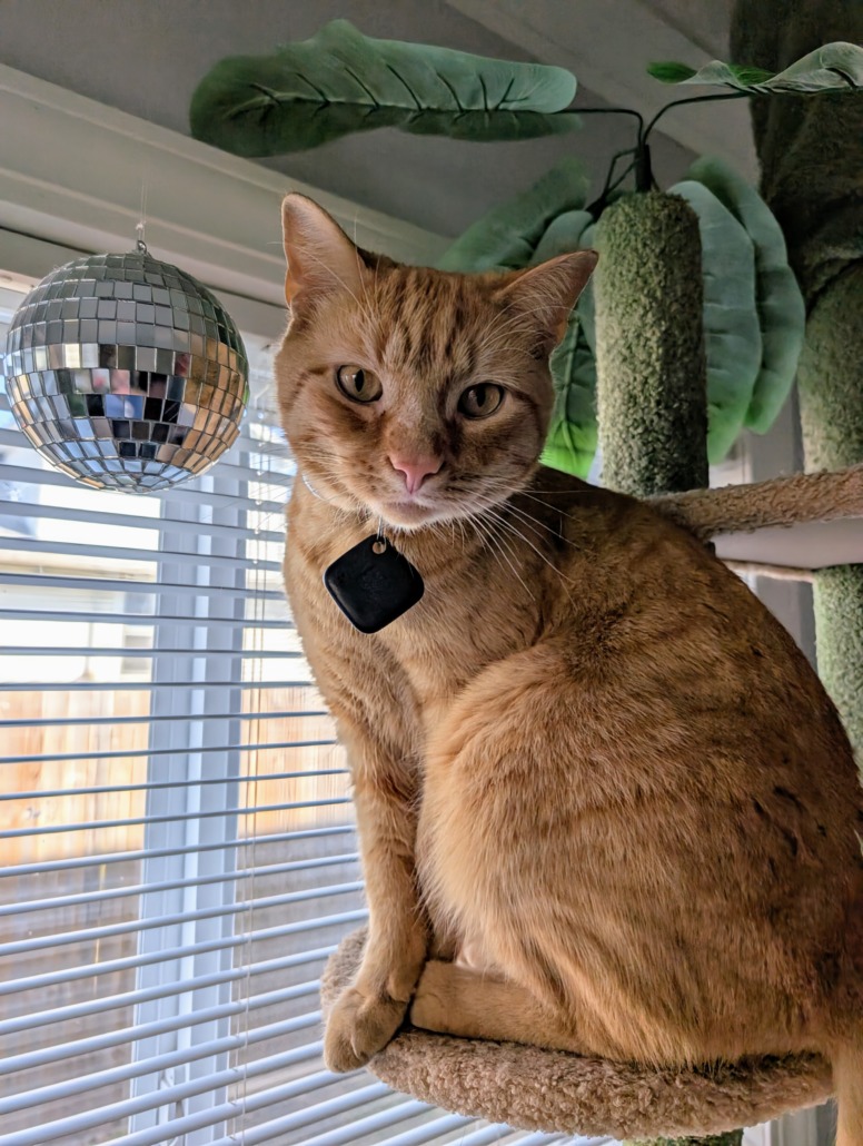 Orange Male cat with a tile tracker on his gray collar. Answers to the name BB. I did not.