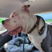Friendly male pit. Wondering around Riva ridge and whirlaway. Mostly white big brown patch on left shoulder with brown spots