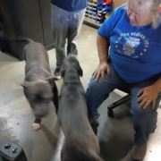 Two extremely friendly gray pitbulls wandered into my work. Don’t know where they came from but they are well groomed and clearly loved. Male and a female