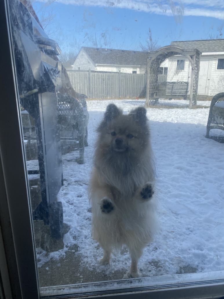 Pomeranian, colors are tan, brown, streaks of silver on back, dark ears and white bushy tail. I had just taken his collar off when we got up so I could adjust it. He got loose before I was able to put it back on him.