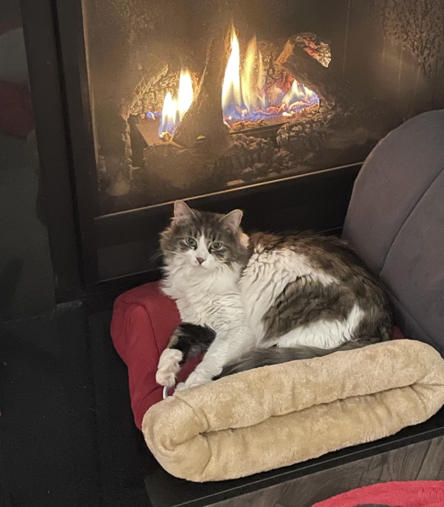 White/Tabby ragdoll cat with long, fluffy fur and tail. Super friendly and loves treats.