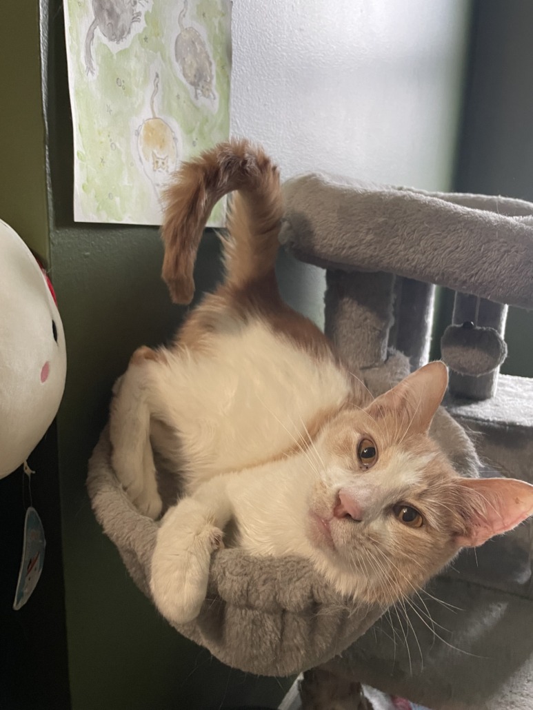 White and orange, 4 years old, hates to have his head pet, friendly, loves food, always has an ear infection.