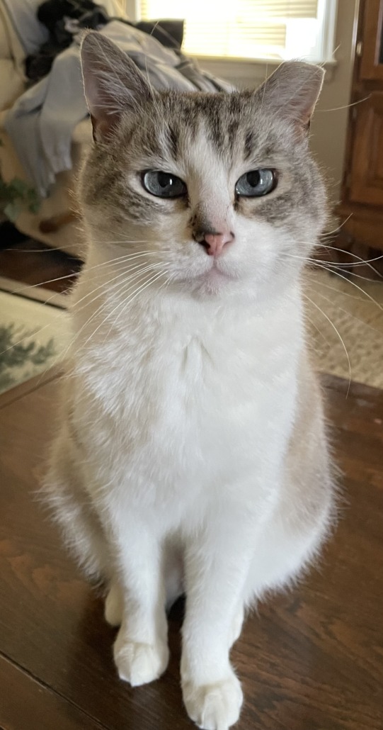 Smokey is a gray over white cat with black and white striped tail with bright blue eyes and a tipped ear.