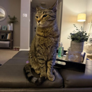 Grey striped tabby. Has health problems that has caused him to lose a significant amount of weight recently and requires medication.