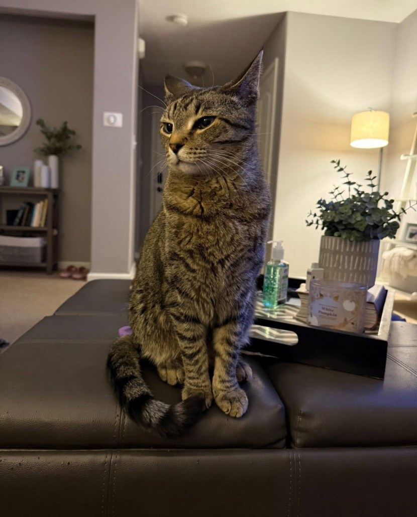 Grey striped tabby. Has health problems that has caused him to lose a significant amount of weight recently and requires medication.
