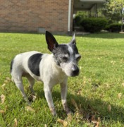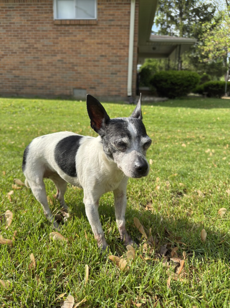 Older black and white spotted female. Chihuahua or rat terrier? Sweet girl, looks to be blind in one eye and potentially hard of hearing. Found near Chapel Hill / Ben Davis area.