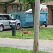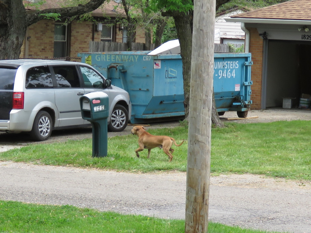 This is a large brown dog (some type of bulldog mix) that has been roaming around for the last two or three weeks.