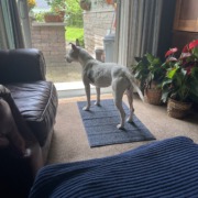 Female, white with brown spot left side, left ear gray! Must prove ownership!