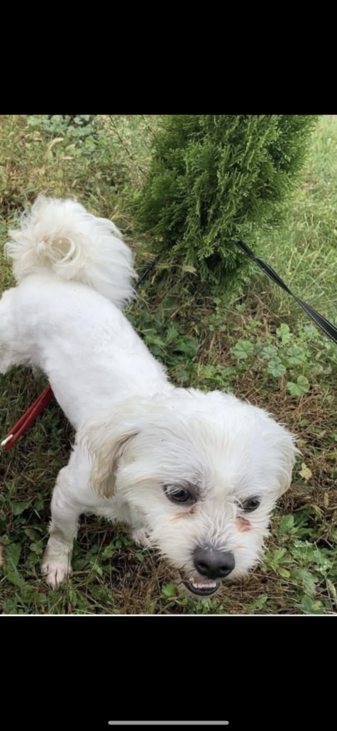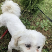 Description: White Shitzu Bichon Medium sized Not microchipped Red collar Black eyes Black nose Fluffy hair Fluffy tail Sprayed & Neutered