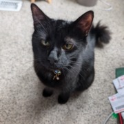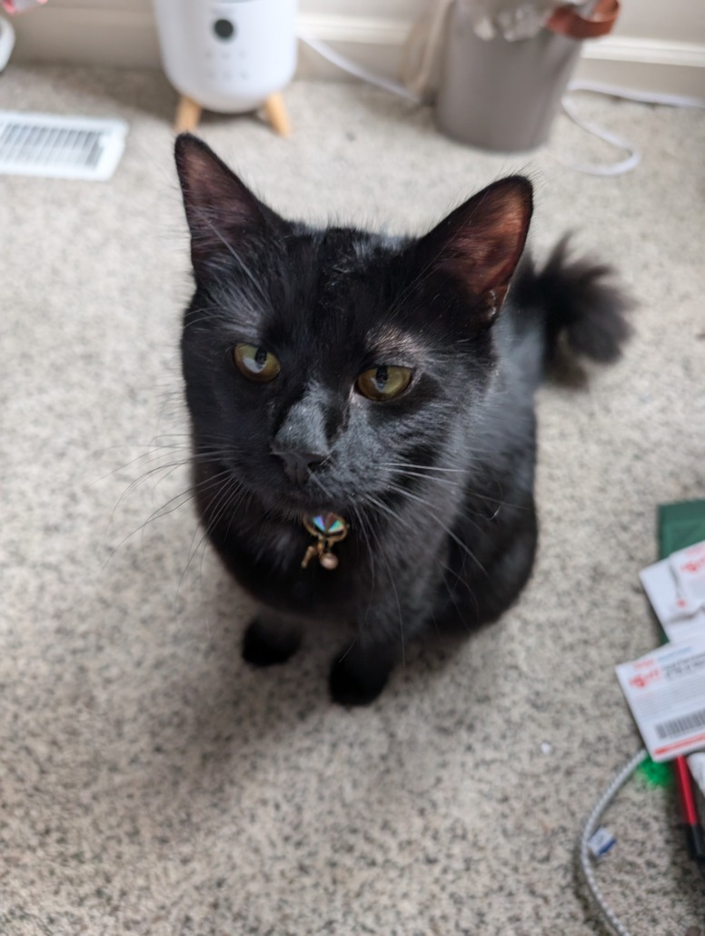 Black cat, found his collar outside of fence. Long fluffy tail, medium hair.