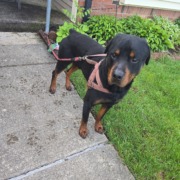 Dog is in his harness and leash.