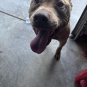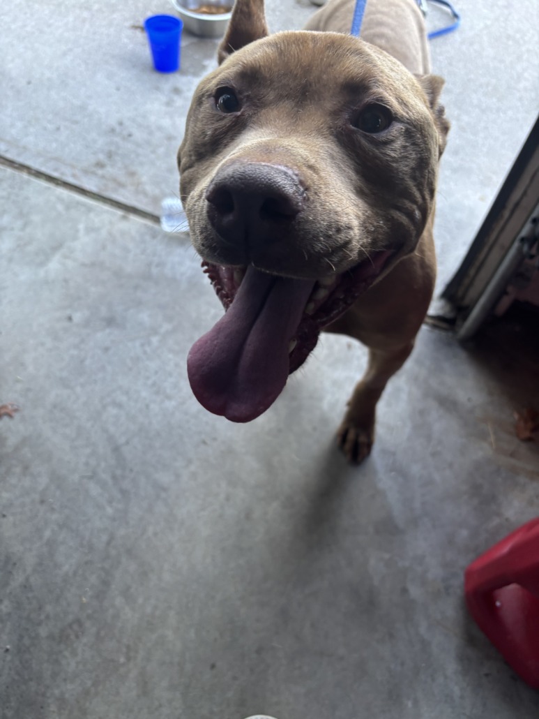Tan, pink nose, light brown eyes, male, intact. Friendly fella. Ears are up. Looks to be pity or pity mix. Has shaved arm like he had recent bloodwork or IV.