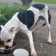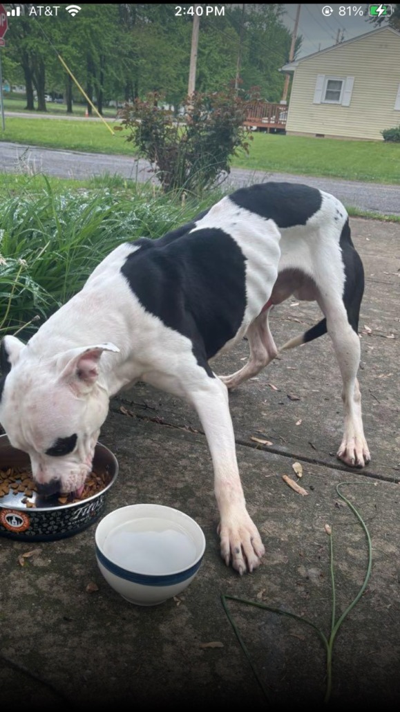 Young male pitbull mix, maybe 1 year old, white with black spots. Black spot on left eye. No collar, no microchip. Severely under weight. Proof of ownership required.