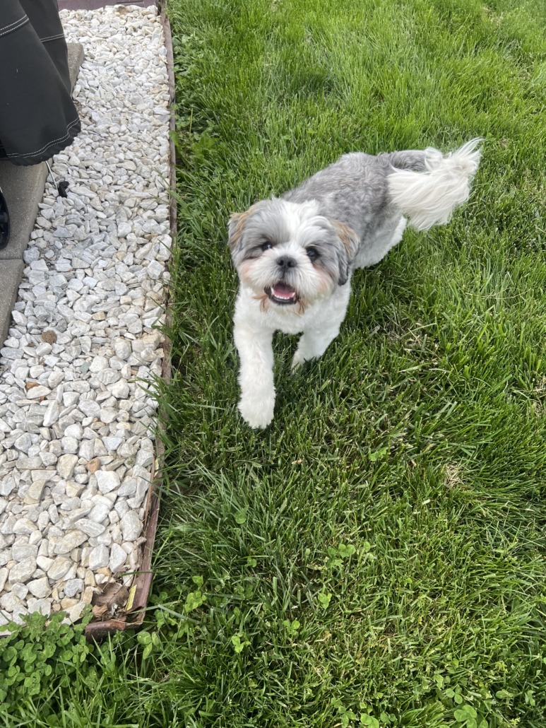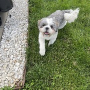 Small white and grey dog. Was wearing a harness. (Harness not pictured for proof of ownership) Proof of ownership required.