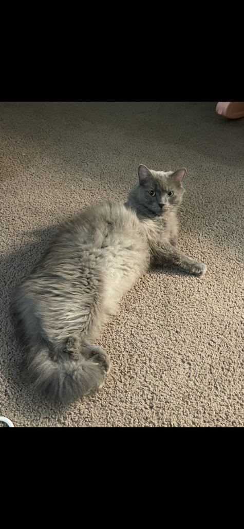 Kenny is a male long haired all grey cat with gold eyes. He is neutered & microchipped. He’s a pretty big cat. He was not wearing a collar.