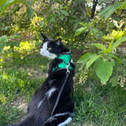 Black and white, sweet social boy. Has whispy white hairs on back and a spot on chin that looks like a soul patch
