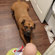 Brown mastiff mix with small patches of gray around muzzle. Neutered.
