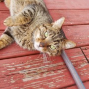 Tabby cat. Appears to be a male. Slightly skiddish, but super friendly. Noticed around end of April. Slightly on the skinny side. Proof of ownership