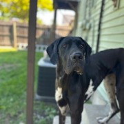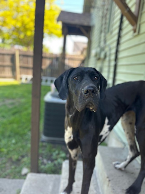 Young, female Great Dane, mostly black with brown and white spots. No collar, no microchip. Very skinny.
