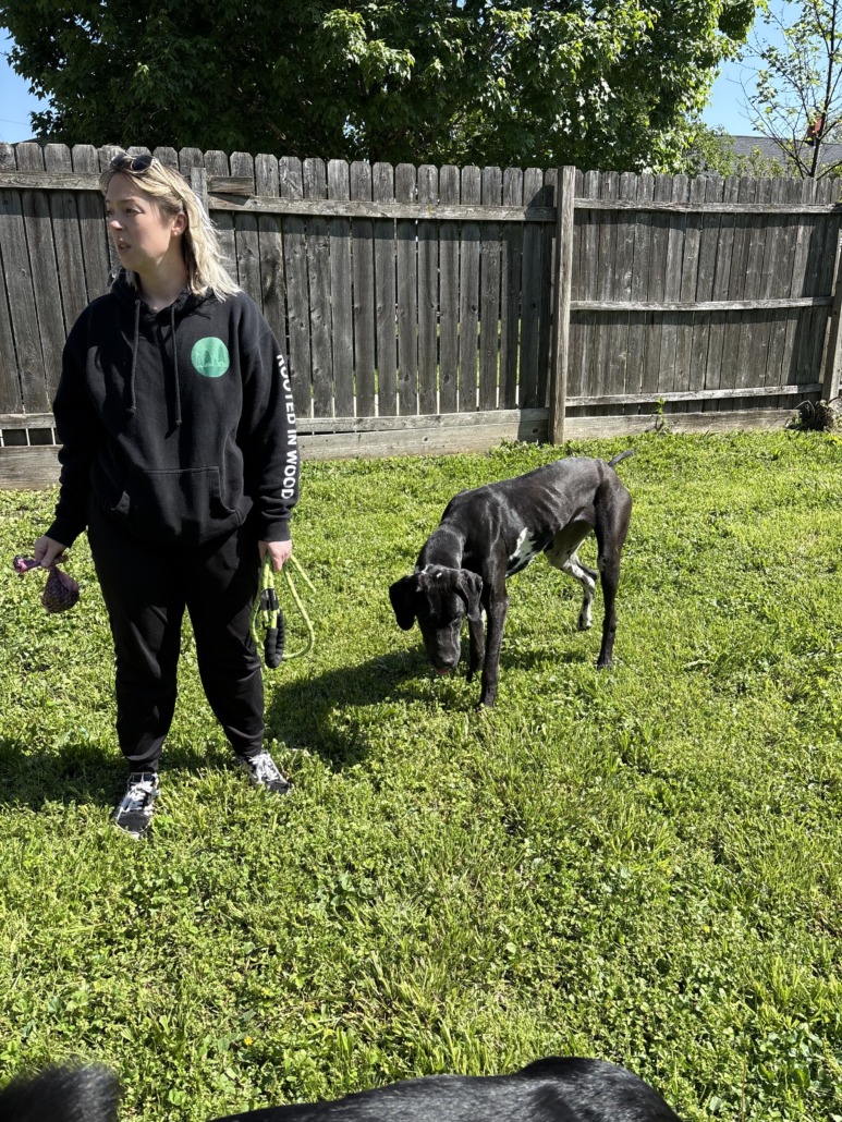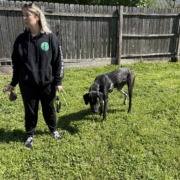 She is very calm. She is black, with white and black spots on the bottom. She isn’t chipped. She is young, the vet said less than one year.