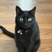 Shy, small black cat with a Bob Marley-esque collar. Really timid with green eyes
