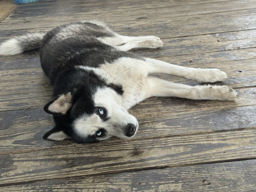 he has on a green vest , he’s very friendly and doesn’t bite at all