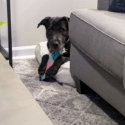 Female black dog with slight wiry white hair on her face. No collar. Is microchipped. – seen going towards highway up 56th past Lafayette Rd