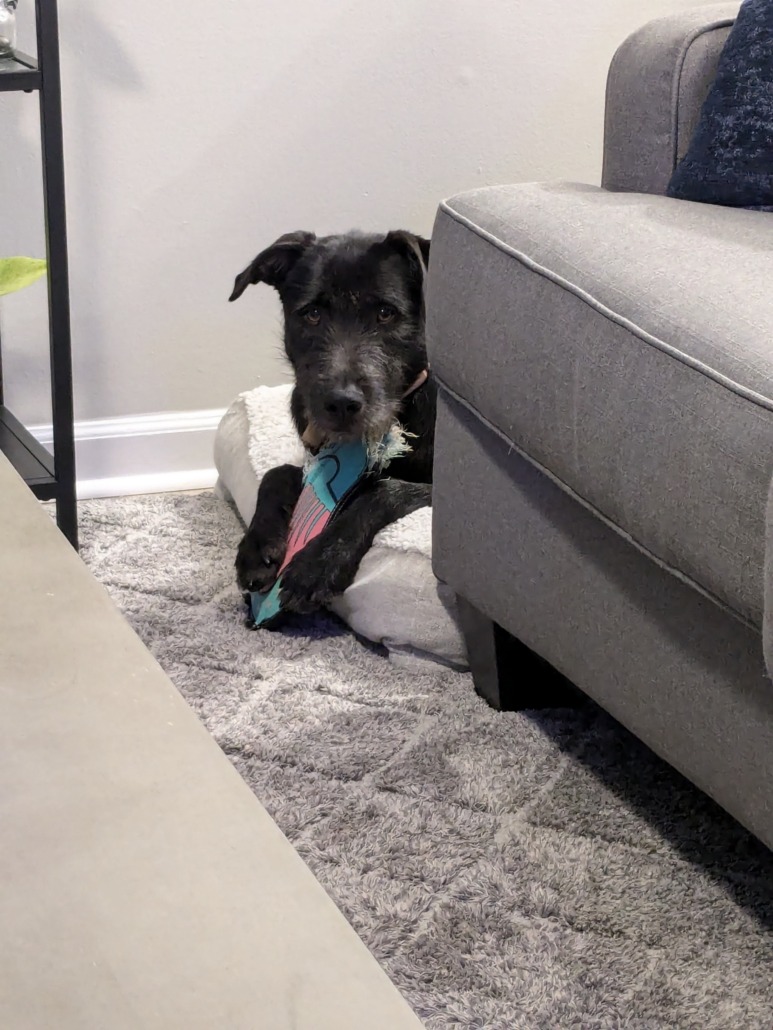 Female black dog with slight wiry white hair on her face. No collar. Is microchipped. – seen going towards highway up 56th past Lafayette Rd