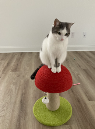Mostly white female cat with gray on face, back, ears, tail, and splotches on paws. Light greenish yellow/chartreuse eyes. Domestic shorthair mix.