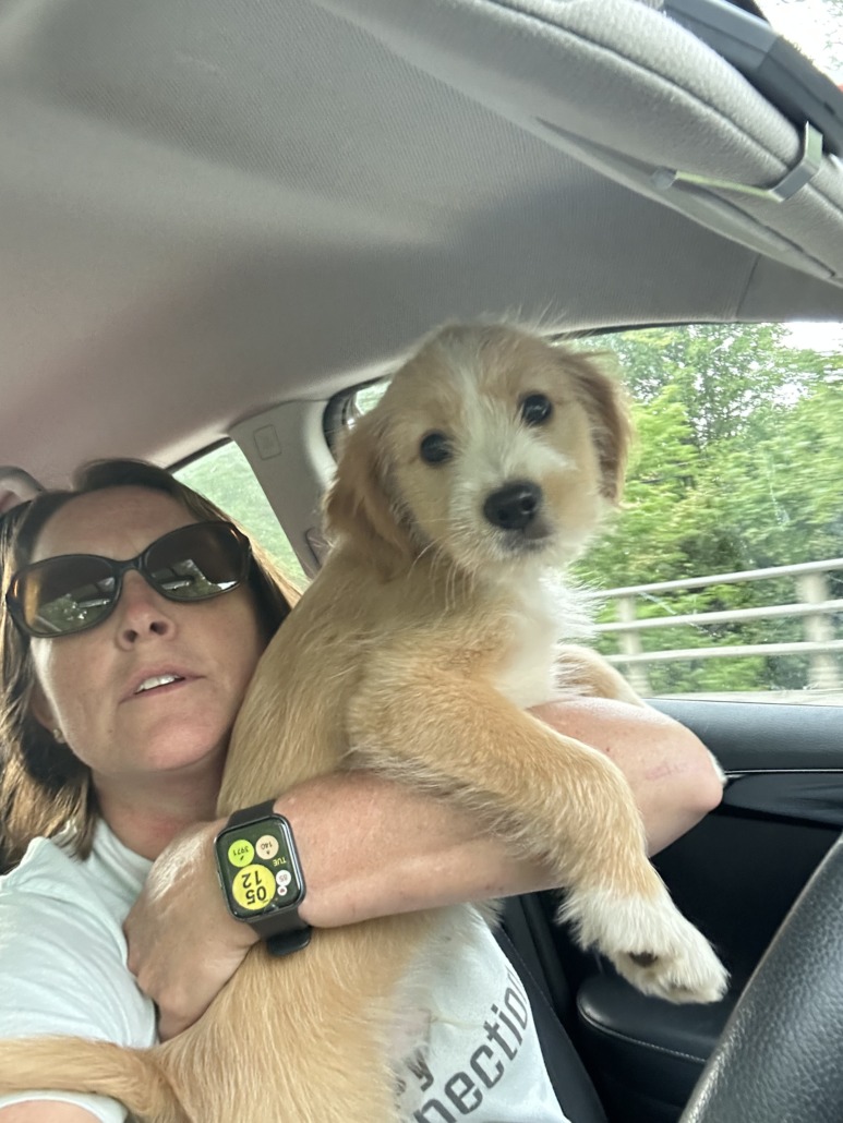 Golden puppy with white paws and white chest and white marking on face. He has a wiry coat. Must provider proof of ownership.