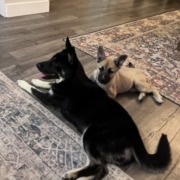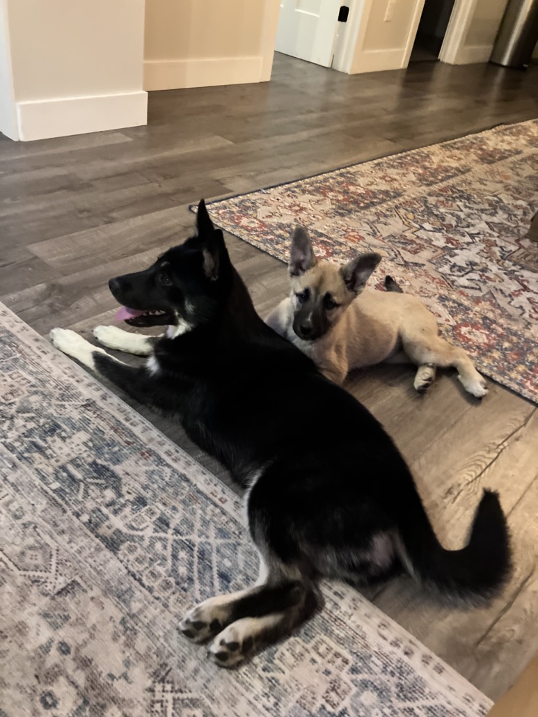 RAVEN IS THE BIGGER BLACK DOG. OCTAVIA IS THE SMALLER GERMAN SHEPARD