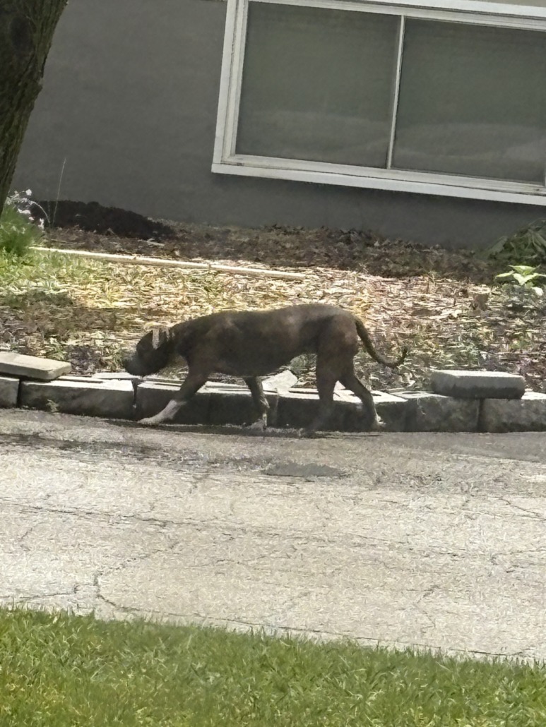 Medium sized pit mix- happily trotting around, but seemed in mild alert when they noticed me looking. Not sure if male or female, and no collar