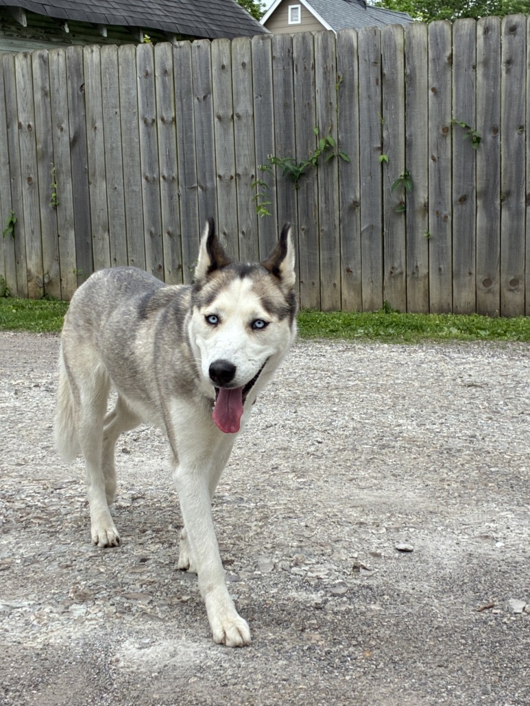 Seems to be a husky/german shepherd mix. Wearing collar with no tag. She is high energy but well behaved, knows a few commands.