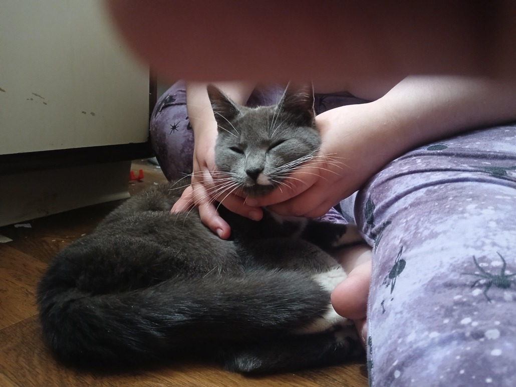 Grey with white patches on their face, belly, paws and leg. Might be female can’t tell.
