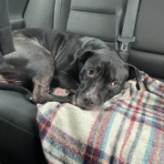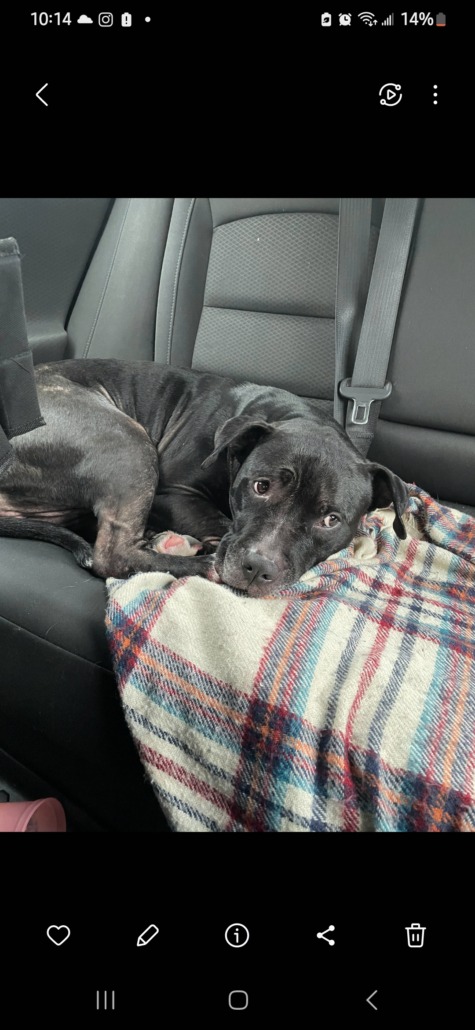 Black pitty mix with some white on her chest and one paw. Very sweet and gentle girl. Seems to be a Lil older.