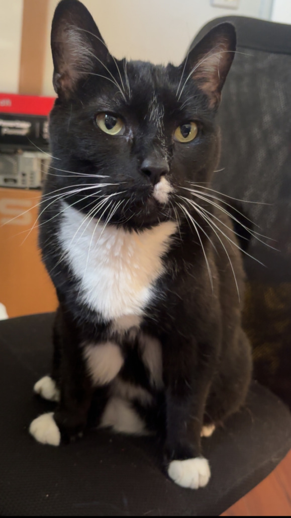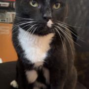 Ezra is a 10 year old neutered and microchipped black tuxedo cat around 12-15lbs. He has a lot of white on his belly and his belly hangs really low because he used to be overweight and lost it all.