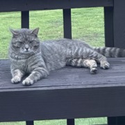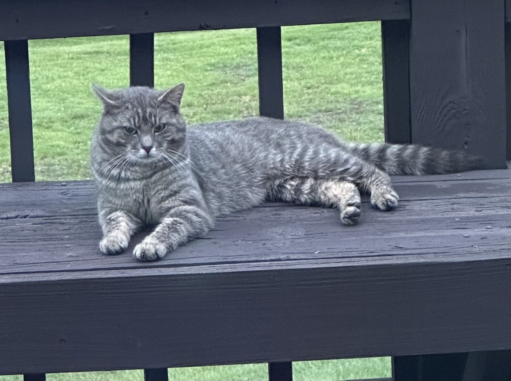 Handsome silver tabby with green eyes has been coming by our backyard that sits on Prestwick Golf Course in Avon. He was first observed on May 14, 2025 and we have made several attempts, but can’t get close to him. We gave him food and water and he eats voraciously. He has been coming by since then in the morning and evening most days. He appears healthy but slightly on the thin side.
