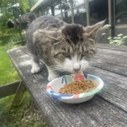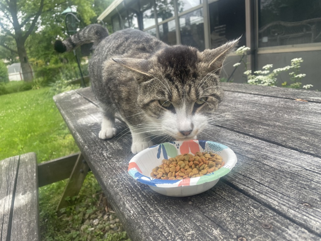 Sweet, gray with different patterns of white and black cat and a calico cat. They seem very young. The calico cat won’t get close enough for a picture.