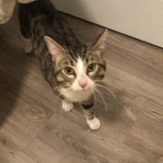 Tabby cat with white belly and feet. No collar. Feels like a healthy weight. Unfixed male. Friendly towards people. Proof of ownership is required.