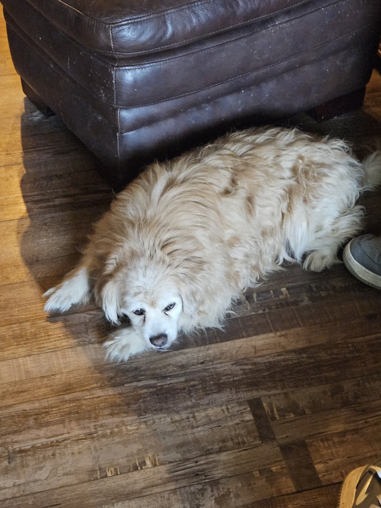 Older male, golden mixed dog. Tanner has a chip and owner Natalie is not responding. Tanner has one very distinct feature, you must tell me what it is to prove ownership.