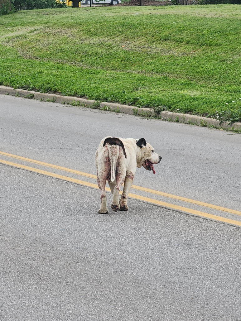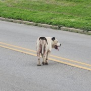 Bully breed seen wandering the road at 25th and hovey. White with brown.