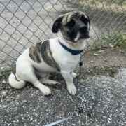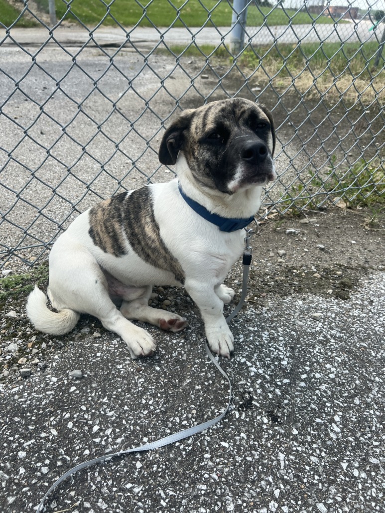 Young pit mix, male, approx 30lbs. Brindle and white coloring.