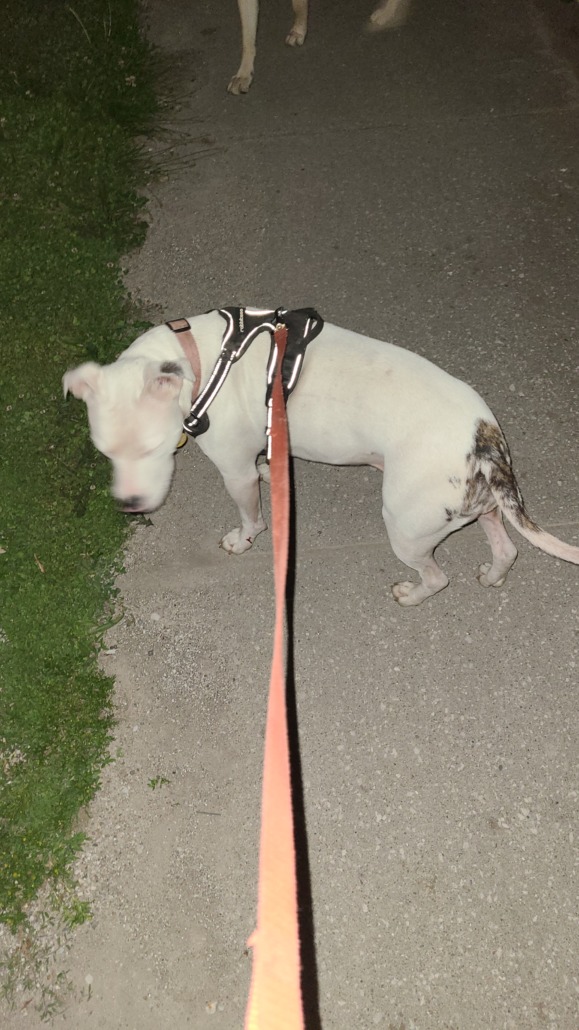 Glizzy is mostly white with some color on top of her tail. Her left eye is blue, her right brown. She is fixed and chipped (shelters don’t have her yet)