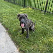 Brindle male. Young and friendly. No collar. Knows sit and stay. Was posted in our neighborhood Nextdoor within the week by another neighbor. Currently have him safe in my garage with food/water/bed but cannot keep him.