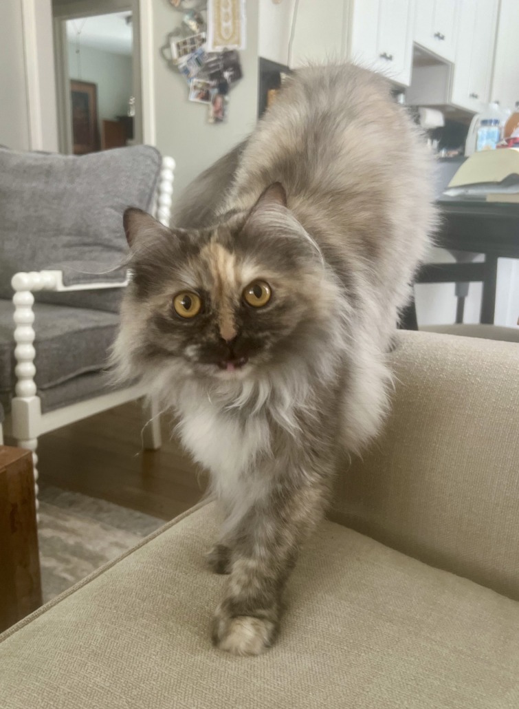 Clementine – chipped but no collar. 2 year old, Long-haired, dilute tortoise or dilute calico (lots of gray mixed in) – looks like a raccoon a little. Not street smart. Fairly recent adoption and she doesn’t respond to my calls. She will probably hide and cry a lot. Please contact me, I’m worried for her. She’s sweet but afraid of humans because not socialized well. We’re working on that. Doesn’t like to be held.