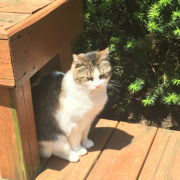 Calico cat with mainly gray markings.Penny is an indoor/outdoor cat with a timid personality.