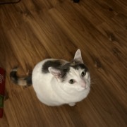 Calico but mostly white, indoor only and very skittish, does not like other cats or dogs and tends to hide or run away from them