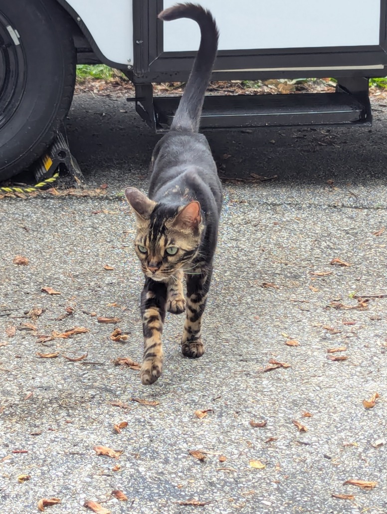 Skinny black with interesting brown pattern cat. Very friendly. Red collar but no tags. Seen several times.